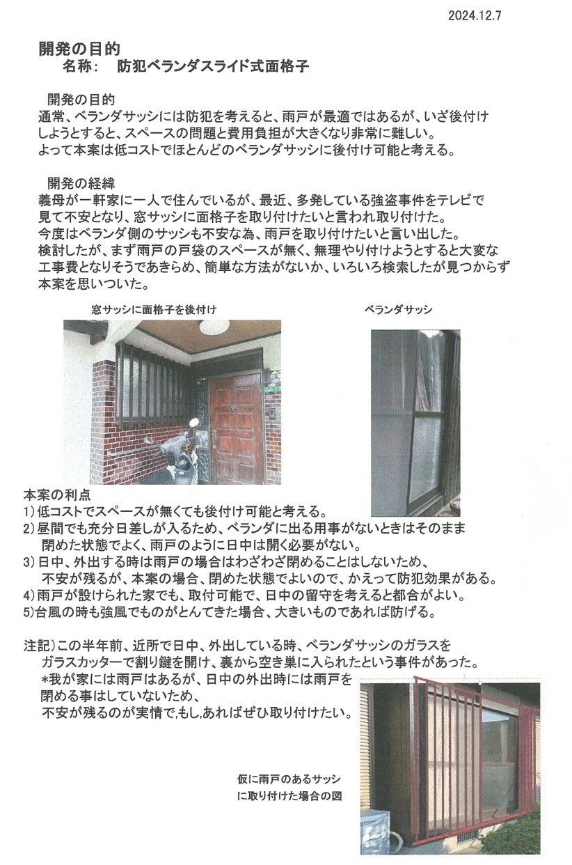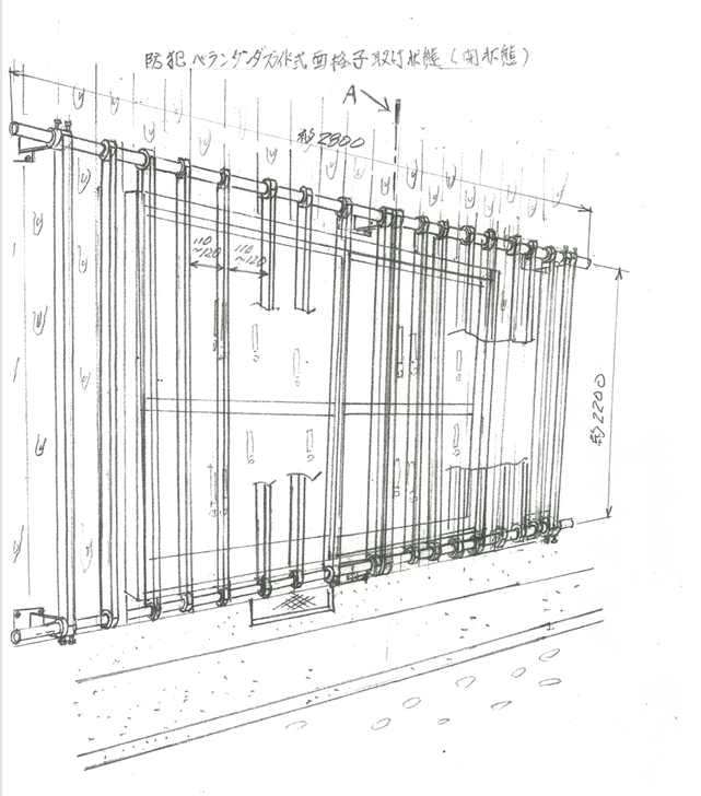 問合せの発明品の名称:防犯ベランダスライド式面格子