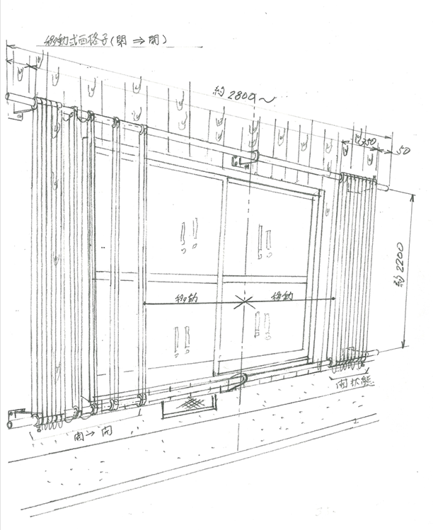 検討したが、まず雨戸の戸袋のスペースが無く、無理やり付けようとすると大変な工事費となりそうであきらめ、簡単な方法がないか、いろいろ検索したが見つからず本案を思いついた。